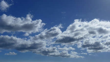 White cumulus clouds in a blue sky. Backgrounds with a pattern of high-beam clouds. Weather, seasonality, ecology, clear sky. Peace