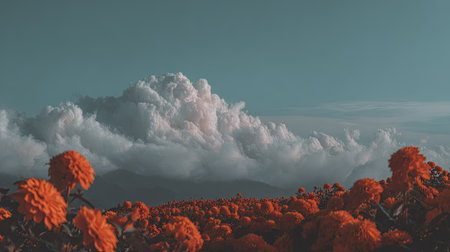 Wide-angle shot captures an expansive field densely packed with intensely colored orange flowers, possibly marigolds, stretching towards hazy, dark mountains in the distance. Above the mountains, a colossal, textured white cumulus cloud dominates the blue-gray sky, creating a striking, stylized contrast between the warm, saturated foreground and the cool, muted background elements.