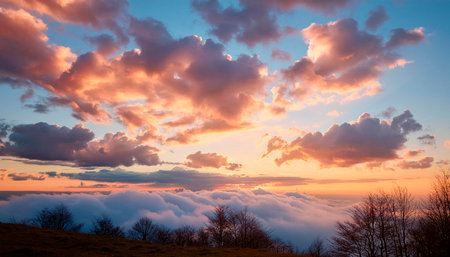 Fluffy clouds glow in warm shades as the sun sets casting a calming light across the sky.