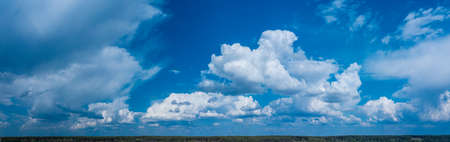 Wide sky panorama with scattered cumulus clouds bilding up before storm. Dramatic sky background