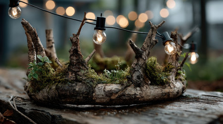 A captivating outdoor scene featuring a natural wood log adorned with lush greenery and ferns, enhanced by twinkling fairy lights, creating a magical ambiance.