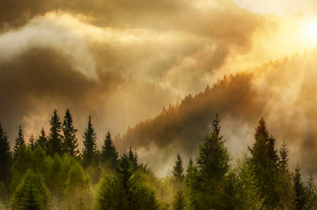Dark green pine trees in moody spruce forest with sunrise light rays shining through branches in foggy fall mountains.