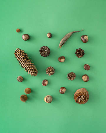 Autumn varieties of plants and colors. Chestnut, pine cone, pod . Minimal autumn arrangement on a dark green background.