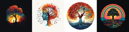 Vector artwork showing a glowing tree under a surreal sky surrounded by mountains, water, and a lone figure, symbolizing life, reflection, and inner journey.