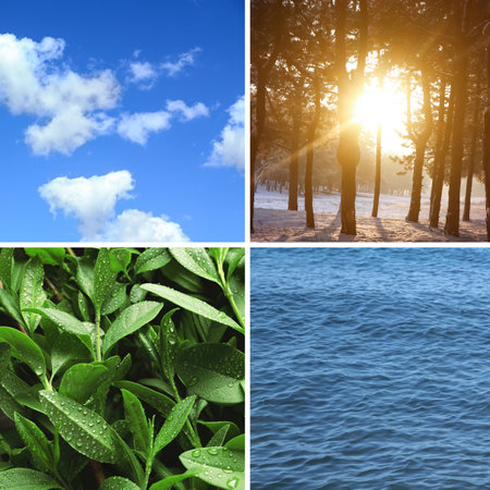 Collage with photos of water, green plants, blue sky and sun. beautiful nature