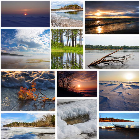 Collage with photos of the Siberian river Ob. River in different seasons