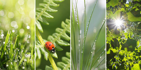 Collage of four Images grass with dew Drops, fern and Lady bird, grass with dew Drops, beach leaves and sunburst