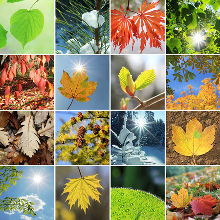 collage - tree leaves and needles in the four seasons