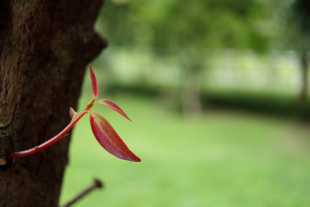 Red brown of young leaves on cinnamon's branch and blur green background. Shoot growing on trunk of cinnamon.