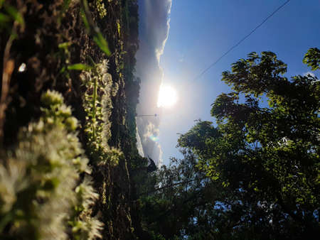 Bottom up view of lush green foliage of tropical trees with morning sun. Tree branches and leaves against blue sky.