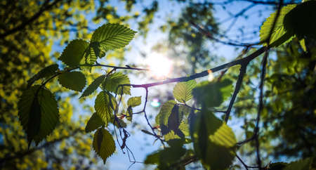 Spring leaves against the background of the setting sun. Nature and the forest around us. Front view.