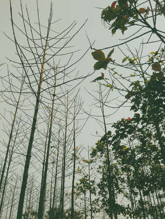 Looking up the trees and leaves from low angle view in autumn forest. Vintage color tone.