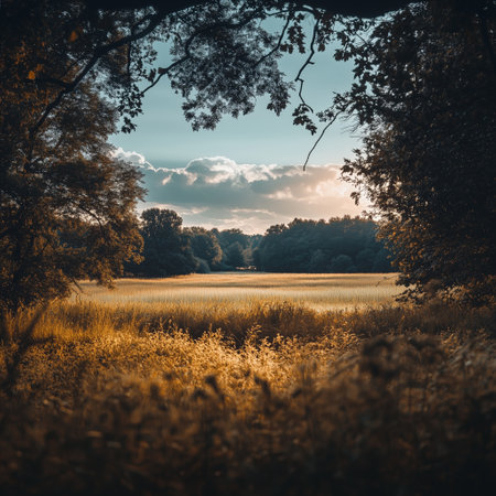 A serene open field illuminated by the soft, golden glow of the setting sun is framed by the silhouettes of trees in the foreground. The image captures the peaceful beauty of nature at sunset,