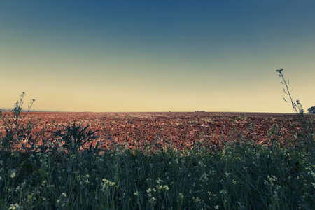 Sunset on the meadow with grass and flowers - retro vintage effect