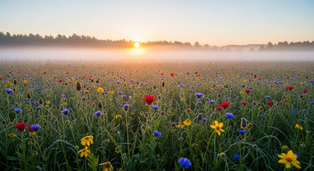 Sunlit meadow with vibrant wildflowers at sunset. Peaceful, idyllic scene.