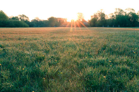 Meadow in spring to the morning sun. Sunbeams over the green grass with single yellow flowers. Trees and bushes in the background. Dew drops on the grass