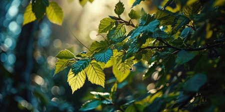 Bright green leaves shimmer in the gentle autumn light among vibrant trees in a peaceful natural setting