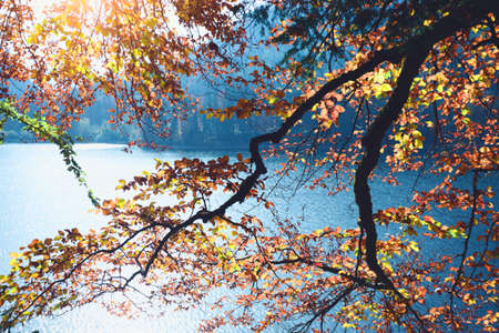 Autumn background. Autumn leaves on tree branch in sunny light with copy space. Beautiful yellow hornbeam leaves on branches in fall. Autumn forest. Tranquil moment