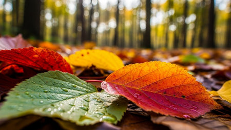 Vibrant autumn leaves glisten under soft sunlight in a forest setting during the fall season