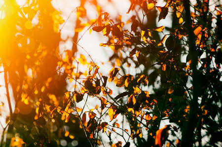 Fancy pattern of autumn foliage in sunlight against the sky, close-up. Abstract leaves background, soft blurred focus.