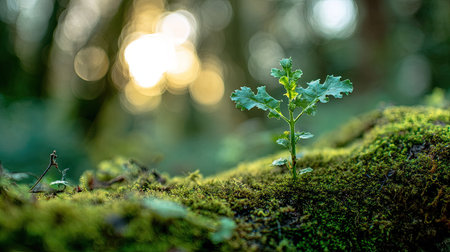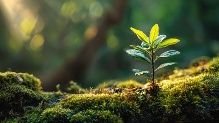 In a calm and lush environment, a small green plant grows on a mossy rock, illuminated by soft natural light.