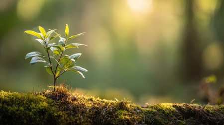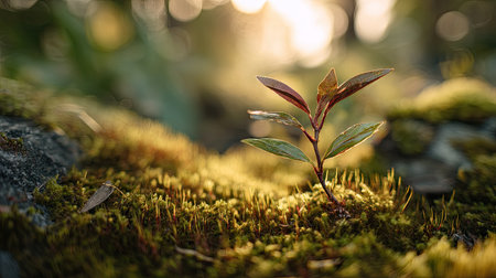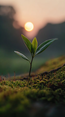 Photo of a young plant growing on moss at sunrise, symbolizing hope and new beginnings.