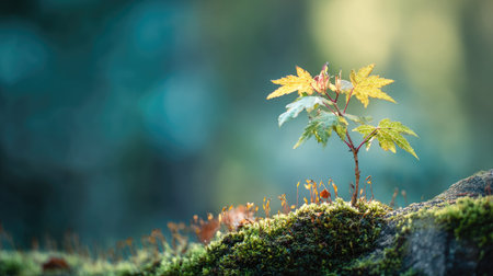 Photo of a small Silver maple growing on moss at sunrise, symbolizing hope and new beginnings. Web banner with copy space on the right for product placement.