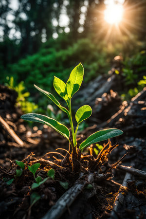 Young green plant sprouting from soil with warm sunlight creating hopeful and fresh atmosphere in nature