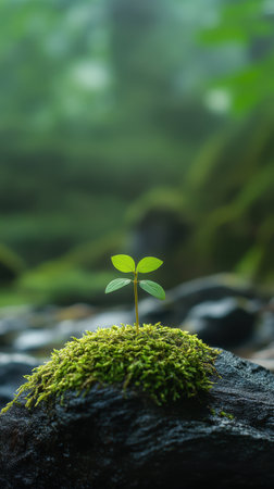 A small vibrant plant emerges from a moss-covered rock, showing its delicate green leaves. The peaceful setting emphasizes the resilience of nature, creating a sense of tranquility and growth.
