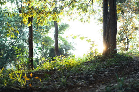 abstract blurred unfocused concept shot of natural park environment branches trees and sun light and glares with bright empty space for copy