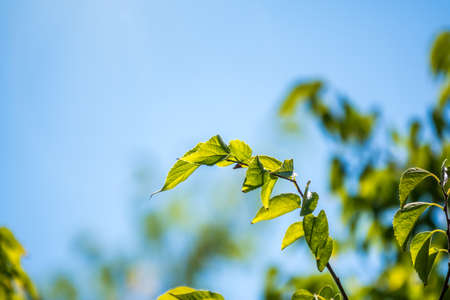 Beautiful, fresh bird cherry leaves against the spring sky. Vibrant seasonal scenery of Northern Europe.
