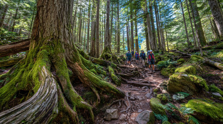 Group of hikers walking on a rocky forest trail, surrounded by dense green trees and moss-covered roots in a vibrant natural setting