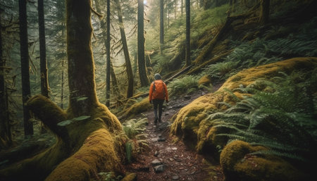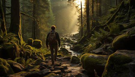 One person backpacking through tranquil forest, enjoying healthy lifestyle generated by artificial intelligence