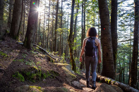 Adventurous Girl Hiking in a Green and Vibrant Rain Forest during a sunny spring day. Taken in Abbotsford, East of Vancouver, British Columbia, Canada. Nature Background Panorama