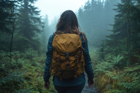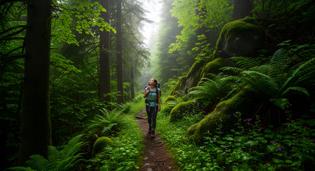 A lone hiker navigates a misty forest trail, surrounded by lush greenery and towering trees, embodying a sense of adventure and tranquility in nature.