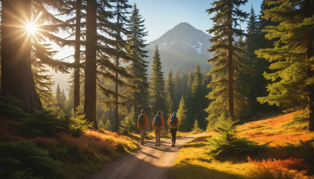 Hikers walking through a sunlit forest with tall trees and a misty background.