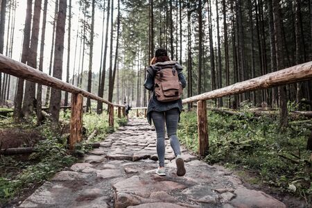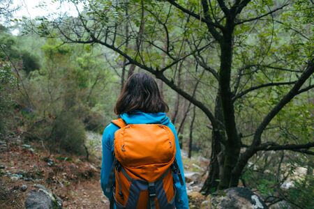 Young woman with backpack walking in the forest. Back view. Copy space.