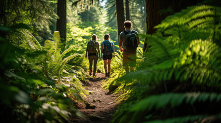 Couple of hikers with backpacks walking along a path in the forest ai generated.“This image was created using generative artificial intelligence tools