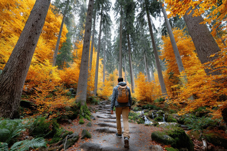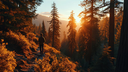 A person walking along a forest trail, with sunlight filtering through the trees generative ai