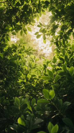 Sunlight filtering through lush green leaves, serene nature scene