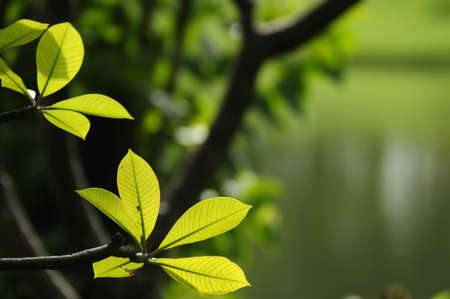 Green leaves with back-lit against background of water