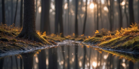 Golden sunlight filtering through lush green foliage, creating a peaceful and serene natural environment, perfect for outdoor and nature themes.