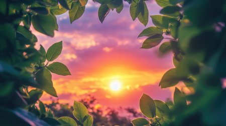 A stunning composition showcasing a vibrant sunset seen through lush green leaves, highlighting the glowing sun and colorful evening sky, perfect for nature lovers.