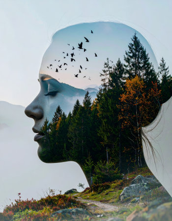 A conceptual image featuring a calm silhouette of a human face filled with a lush green forest landscape. High quality photo
