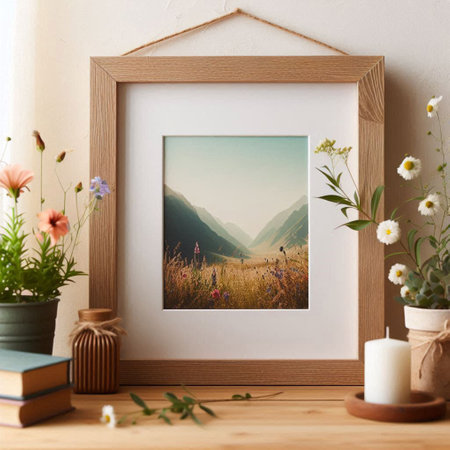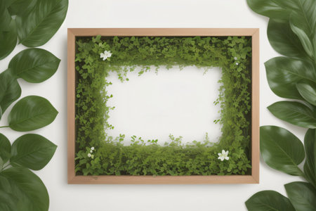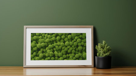 a sleek, modern moss green frame sits elegantly on a wooden table, exuding a sense of calm and serenity, perfect for showcasing cherished memories or artistic prints in a minimalist-inspired home decor, blending seamlessly with natural wood accents and earthy tones. ai generated