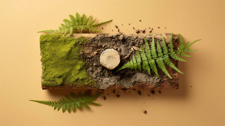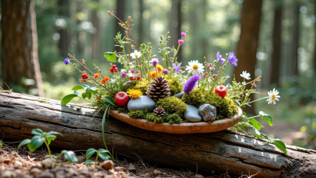 Forest arrangement with pinecones, ferns, and wildflowers on fallen log. That the image is generated using AI.