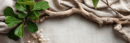 A lush branch of a fig tree gracefully drapes over a soft linen cloth, creating an inviting rustic setup with ample blank space above for additional elements.