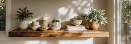 An arrangement of ceramic pots and plants on a wooden shelf against a bright wall, creating a cozy and stylish atmosphere in the room.