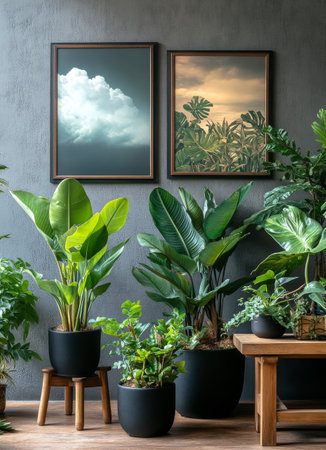Brightly lit indoor space featuring a variety of greenery including tropical plants. A stylish wooden table complements the vibrant foliage and artwork on the walls, enhancing the serene ambiance.