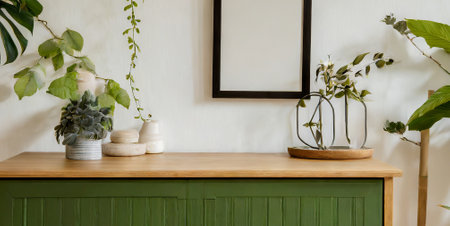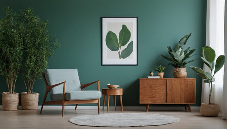 Interior of modern living room with green and white walls, wooden cupboard, plant and mock up frame